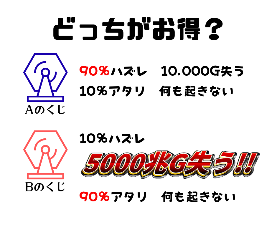 それであれば、例え期待値が劣っていたとしても、負けのくじが出てくる可能性が低いBのくじを引くべき、と判断できます。