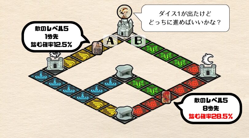 答えは「左回りに歩き出してAの土地に着地する」です。グラフで示した通り、1歩先の高額を踏む確率は12.5%です。しかし、右回りに歩いてBに着地した場合、28.5%の確率でレベル5を踏んでしまいます。